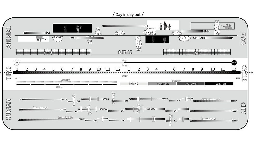 動物園住著各式各樣的動物,開園、閉園是牠們計算時間的單位,動物的過度擁擠、焦慮、孤獨、重複的日子就像是現代城市的翻版。
